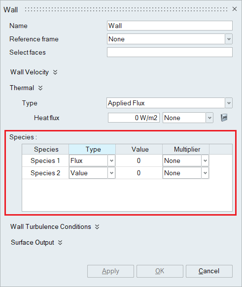 When the number of species is specified in the Solutions panel, the Species option becomes available in the wall boundary condition panel. The species value should be mentioned appropriately.
