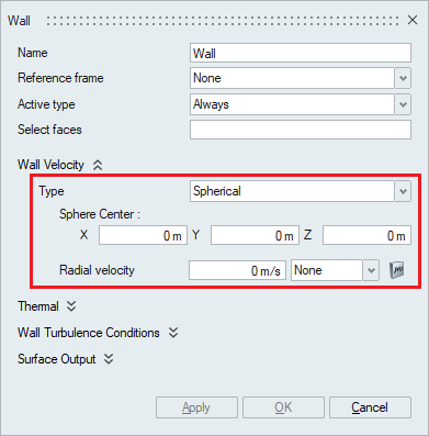 • A wall velocity type of Spherical imposes a given boundary condition on the radial component of the velocity in a spherical coordinate system and zero boundary conditions on the other two components. The Sphere center needs to be specified in this case.