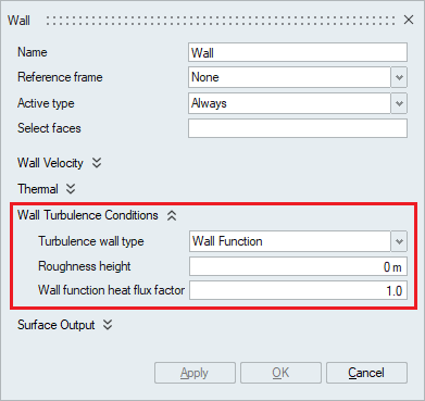 The turbulence wall type should be specified to define the turbulent boundary layer. Either of the four available options None, Low Reynolds Number, Wall function and Running average wall function should be selected under the turbulence wall type.