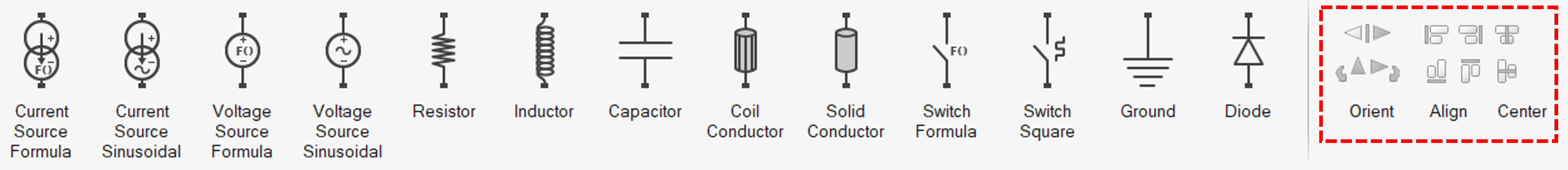 The orient options are used to change the orientation of single components while the align and center tools are used to change the positioning of a group of components. Multiple components can be selected by holding the ctrl button and selecting the components.