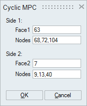 This option is used to connect node pairs in cyclic symmetric models. The faces should have identical node pattern to connect as cyclic MPC. The faces with identical node pairs can be created using symmetry mesh control. On Nastran export, the Cyclic MPC toggle should be turned ON to export as cyclic MPC, if the toggle is OFF, then it will be exported as MPC.