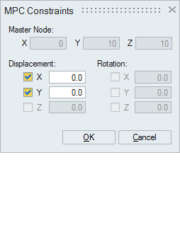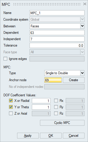 This option is used to define MPC equation between one dependent and one independent Node. User can also select dependent and independent Edges/Faces. SimLab automatically finds dependent and independent node pairs from the selected faces/edges.
