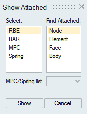 This option will find nodes, elements, faces and body connected with RBE, Bar, MPC and spring. Selecting the RBE or bar body will find the attached Nodes/Elements/Faces/Body. Also RBE/Bar element can be selected to find the attached Nodes/Elements/Faces/Body. For MPC and spring the applied loads are listed in the LBC list, attached Nodes/Elements/ Faces/Body for the selected load will be displayed. If there are multiple body present in the model and when find a body attached with RBE/Bar/MPC/Spring, it will display only the particular body connected with RBE/Bar/MPC/Spring.
