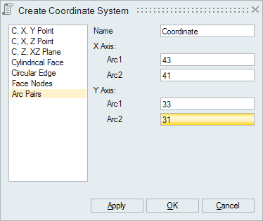 Select two arc pairs to define two local coordinate systems. One of the arc pair will be used to define the X-axis and another arc pair to define the Y-axis.