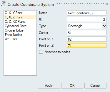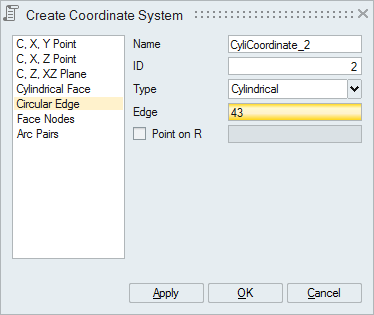 Select a circular edge to define a local coordinate system with Z-axis along the axis of circular edge. Also there is an option to define the R-axis by selecting a node.