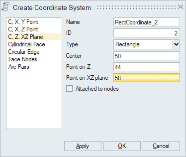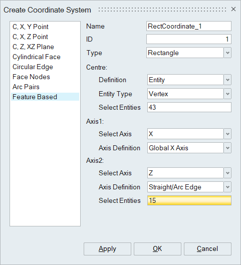 • In Feature based coordinate creation method, If Axis 1 and Axis 2 are not initially perpendicular based on the selected entities, the definition of Axis 2 is automatically adjusted to "Arbitrary" to enforce a perpendicular orientation between Axis 1 and Axis 2.