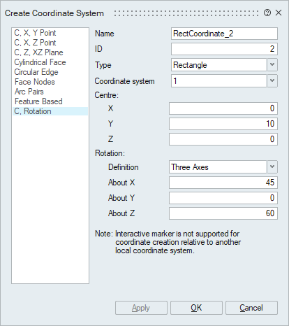 The coordinate centre can be defined by specifying the global spatial location. The axes can be defined by specifying the rotation angle with respect to each global axis. Centre and rotation can be defined with respect to Global or any other local coordinate system. The Rotation angles of the axes can be defined by,