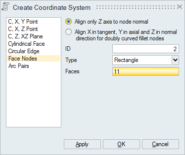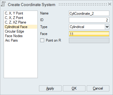 Select a cylindrical face to define a local coordinate system with Z-axis along the axis of cylindrical face. Also there is an option to define the R-axis by selecting a node.