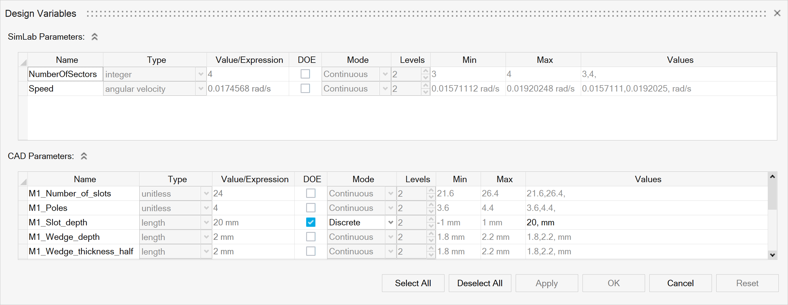 • Values:Based on the levels and Min/Max, the DOE values will be calculated and listed.