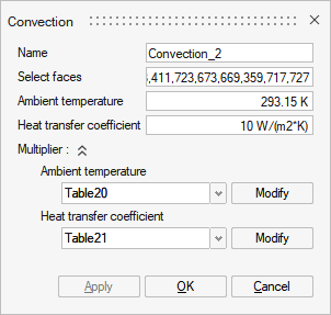 - Convection heat transfer coefficient can be applied to to one or multiple surfaces.