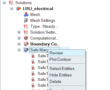 This tool provides the information that helps user to review the Thermal sustainability of electrical components under given thermal conditions. Once solution is solved, the users can check whether the given electrical component is safe or not under the given thermal condition. This is done with the help of Review and Plot Contour tool.