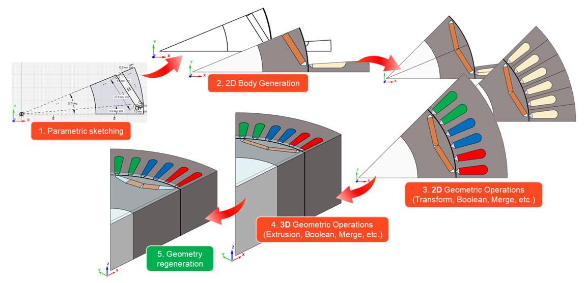 Figure 1. Illustration of a 3D parameterized motor model creation in SimLab