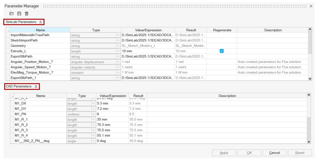 The parameters are listed in the SimLab Parameter Manager:- SimLab Parameters contain the parameters used in SimLab geometry operations and the physical parameters