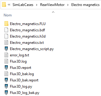 Additionally to the project *.FLU other files are stored to be able to reproduce the full operations done (*.bdf, *.h3d, *.py) and log files to track a potential problem (*.log, *.report).