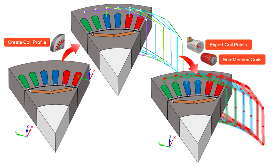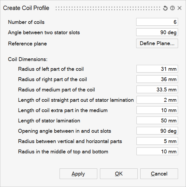 This tool generates the winding coil for motor bodies based on specified dimensions. The coil profile is initially represented as a wire mesh body. Using the Export Coil Points tool, users can then convert this wire mesh into a Non-Meshed Coil representation.
