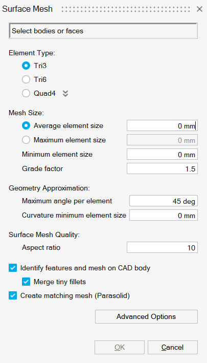 Global parameters to mesh surfaces of a body with 2D elements (TRI/QUAD) is specified using the Surface Mesh dialog box. The 2D element types supported are: