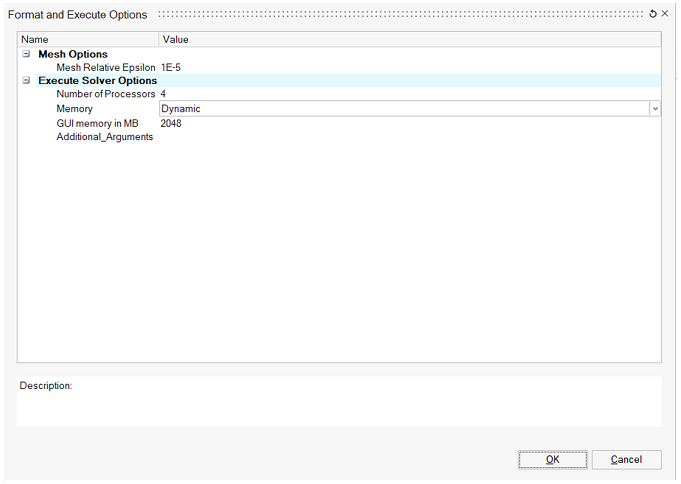 - Additional_Arguments is an advanced option to add additional arguments information like system memory, PEEC memory and so on. Input should be space separator. Example: -fluxncores 4 -memsizn3_mb 6000 -memsizc3_mb 200