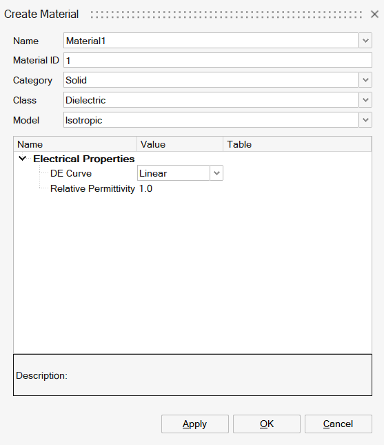 - Enter a name for the material. By default, the class is selected as Dielectric for the electrostatic solution.