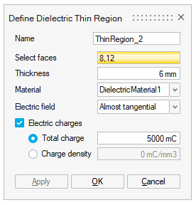 In ElectroStatics 3D, only one type of Thin Region is available: Dielectric Thin Region:
