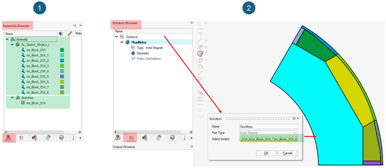 - In the Solution Browser, all new bodies are automatically assigned to the FluxMotor solution.