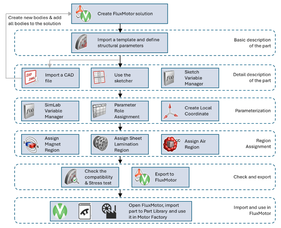 The workflow is completed by the import and usage action in FluxMotor Part Library and FluxMotor Motor Factory.