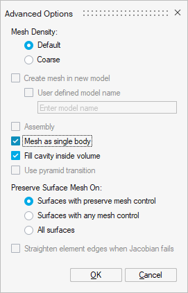 • a conforming volume mesh, so the Mesh as single body option is checked by default (this option is available in the Advanced Options, see Step 4).