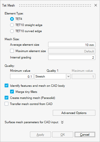 Important: The Create matching mesh (Parasolid) option must be checked if you mesh CAD bodies directly with Tet Mesh (without using Surface Mesh) in order to have a conforming surface mesh.