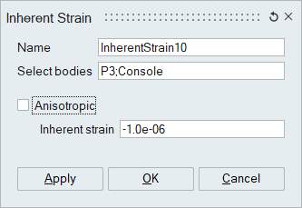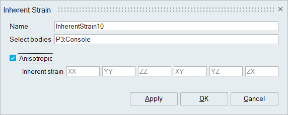 Inherent Strain Tensor is in general a 3x3 matrix which defines the inelastic deformation of the welding parts.Selects bodies (mostly weld beads) and assigns this inherent strain tensor data.