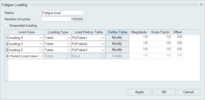 - The load history can be defined using predefined fatigue loading types or using user defined loading tables.