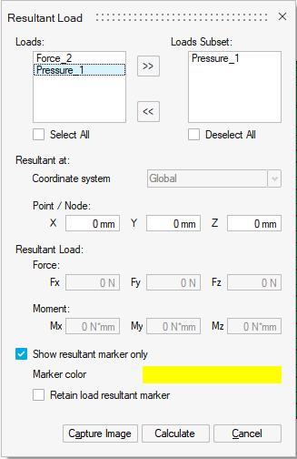 The components of moment will be calculated based on the point input and the coordinate system selected. The point input is assumed in global coordinate system. Loads column will list the pressure and force. Loads (pressure and force), which are based on local coordinate system will also be listed. User can move a set of pressure and force from Loads column to the Loads Subset column and calculate the resultant force and moment about a point.