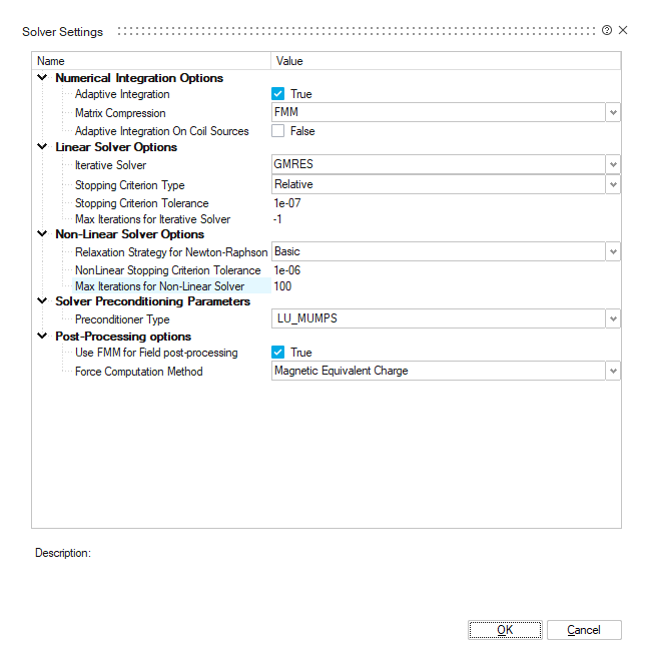 - Adaptive Integration On Coil Sources: By default, this option is unchecked (False). This option allows when checked to compute with more accuracy the coil - solid interactions. The algorithm behind it is not well optimized and can take a bit more time computation.