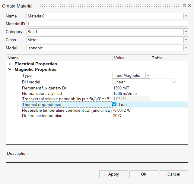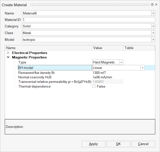 Linearity is considered in the direction of magnetization, as well as in the transversal directions, but the remanent flux density Br is only applied in the direction of magnetization. In fact, this magnet model is noted as unidirectional because the mathematical model and the direction of magnetization are dissociated. The mathematical model defines the demagnetization curve, while the direction of magnetization is defined by the orientation in the region.