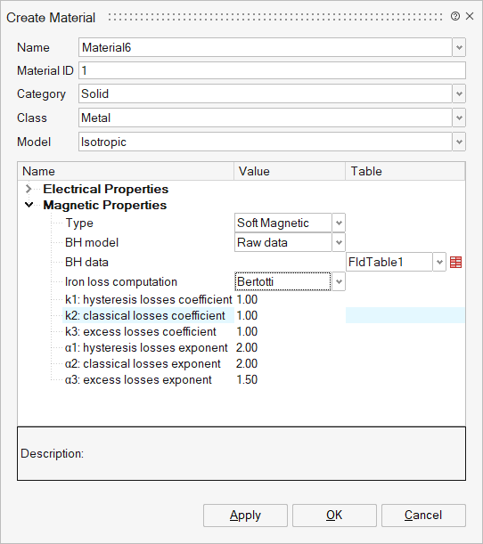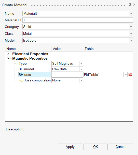 • Define a table by couple of Magnetic Field / Magnetic Flux Density by clicking on