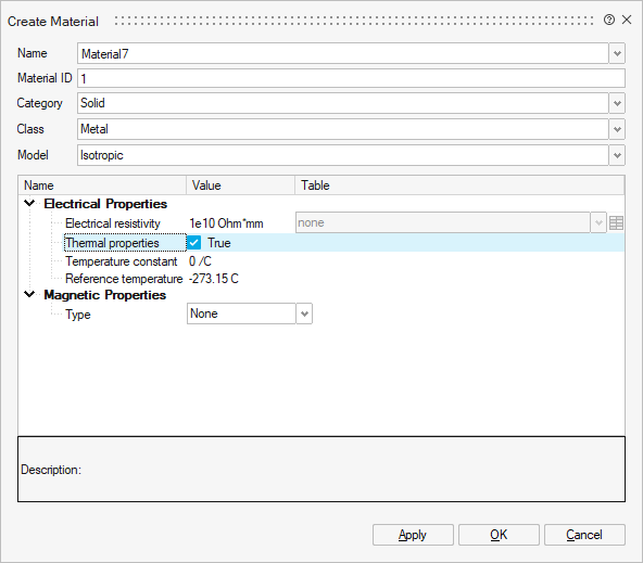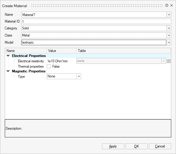 • Open a Create Material dialog box in menu Analysis > Material > Create