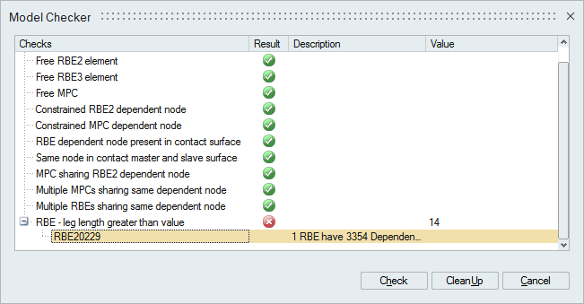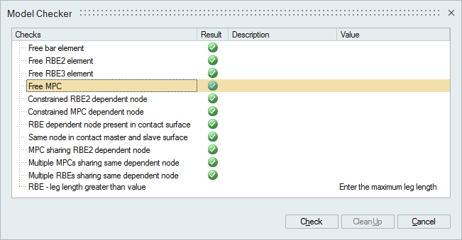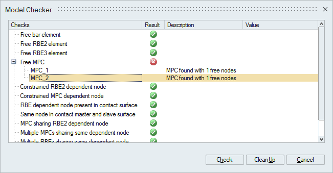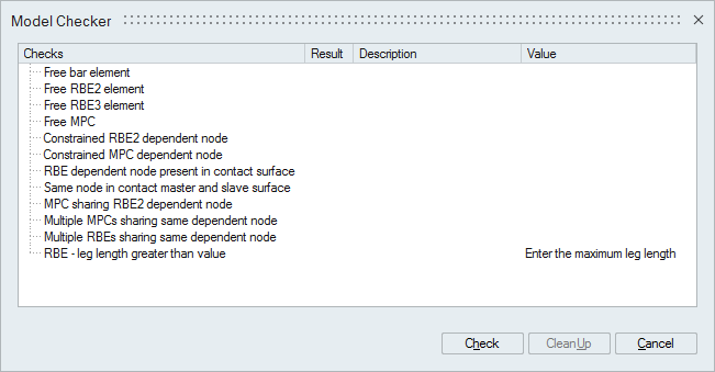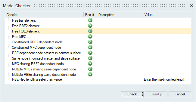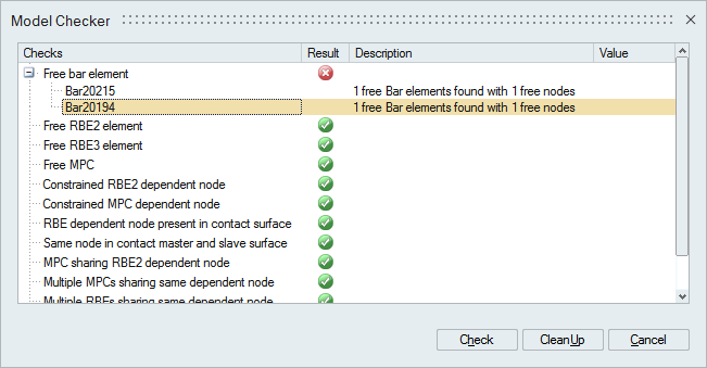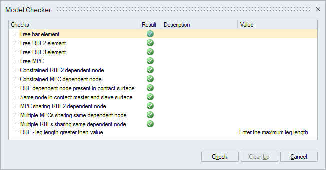 This tool identifies and cleans up errors in a FE model which otherwise will lead to errors during solver run. The model checker checks for errors as listed in the dialog.