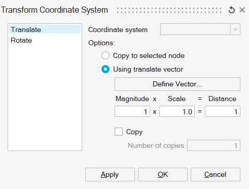 Once the coordinate system creation done, it is possible to Transform the created coordinate system either by translation or rotation.