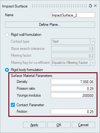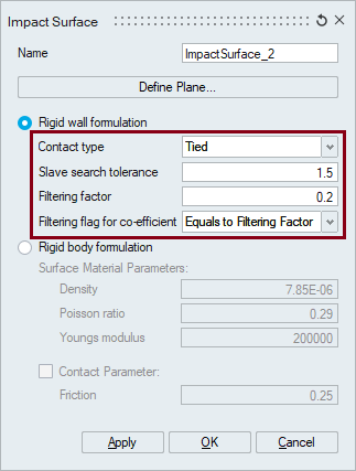 This option is used to define the impact surface as "Rigid Wall". Only infinite plane type is supported in Rigid wall formulation.