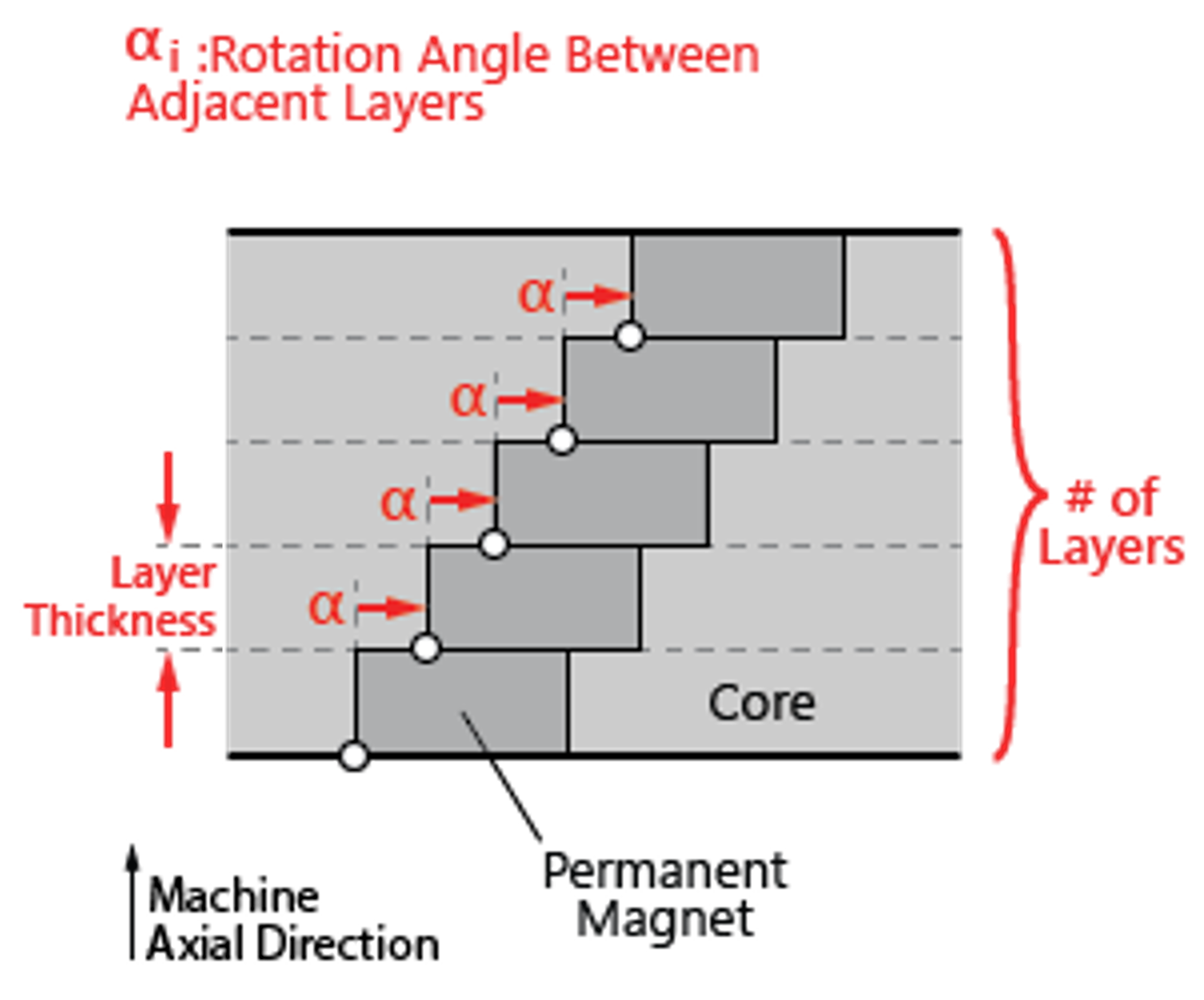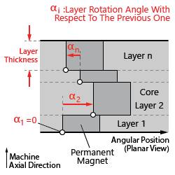 In the more specific context of the permanent magnet machine design, a related design technique known as step-skewing is also commonly employed. It corresponds to modifying the angular position of the permanent magnets along the axial direction of the machine in discrete steps, as shown in Figure 2.