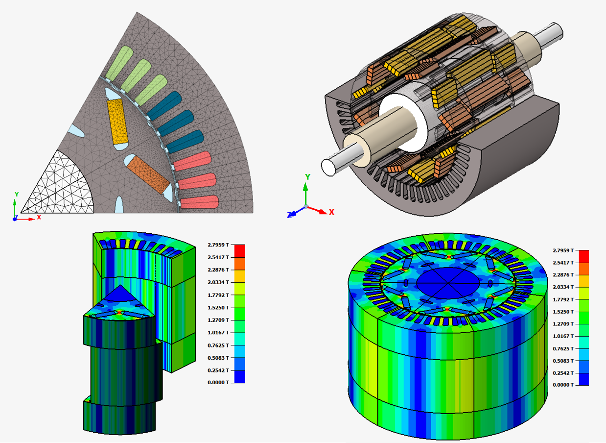 - The transition from a 2D description of the machine to the 3D analysis of the results is possible due to the specialized physical applications provided by the Skewed Motor option, which consider the effects arising from the skewing
