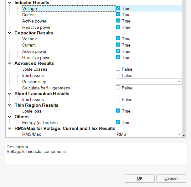 RMS/Max for Voltage, Current and Flux Results