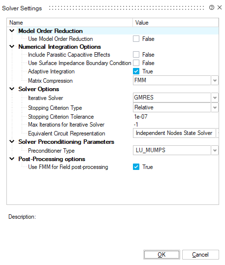 for better interpolation of results within a frequency range.Note: This method only works when using the "state" solvers in the "Equivalent Circuit Representation" option.Note: The export of the reduced model is not available.Important: The Model Order Reduction option doesn't work when the Surface Impedance Boundary Condition option is enabled.