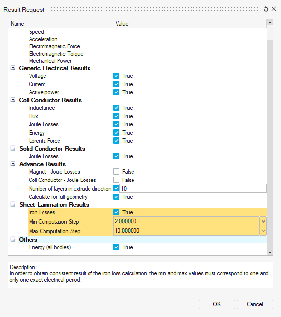 To be able to compute the iron losses in SimLab, the material assigned to the body defined by a sheet lamination load should be a soft magnetic material with 3 coefficients and 3 exponents of Bertotti Model.