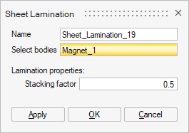 The Sheet Lamination allows to define stacked magnetic sheets and allows to compute iron losses (only Bertotti model at this time).