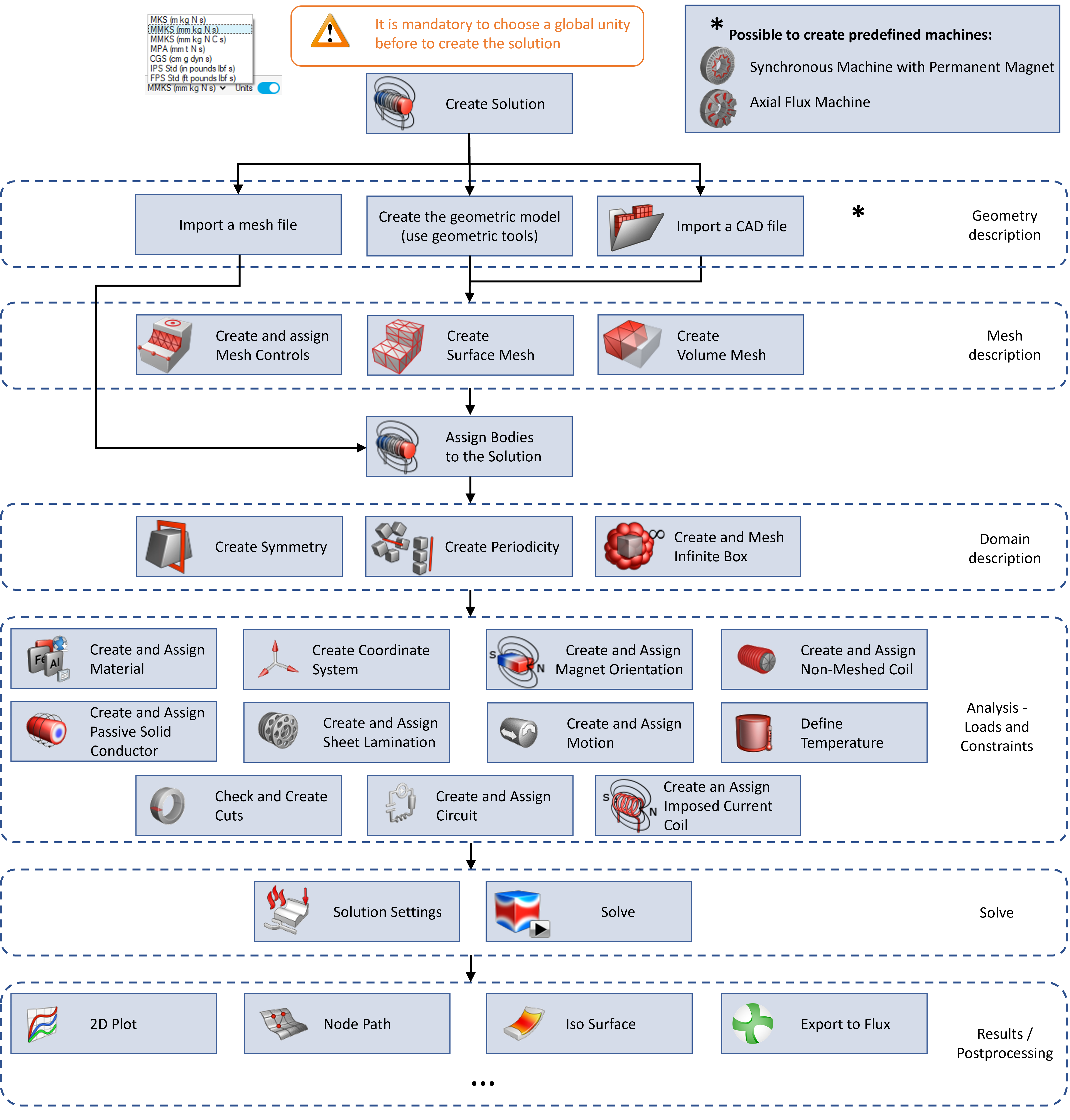 A graphic view of the Transient Magnetic 3D workflow with functionalities possibles is presented below.