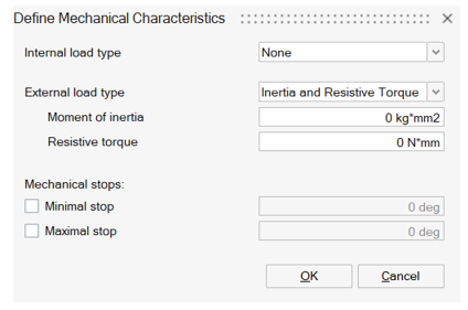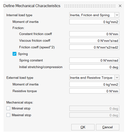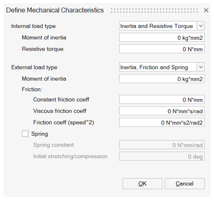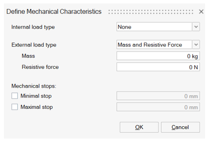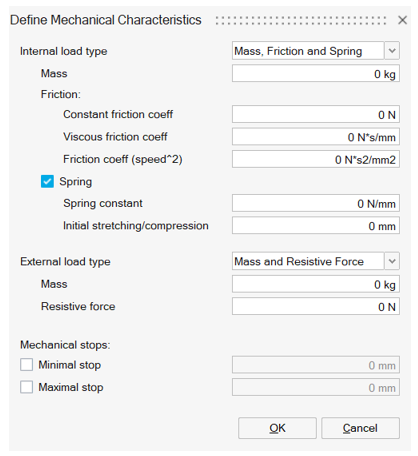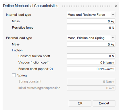 - Open Define Mechanical Characteristics. Define Internal load type as Mass, Friction and Spring. And enter the Mass as 0.25Kg.