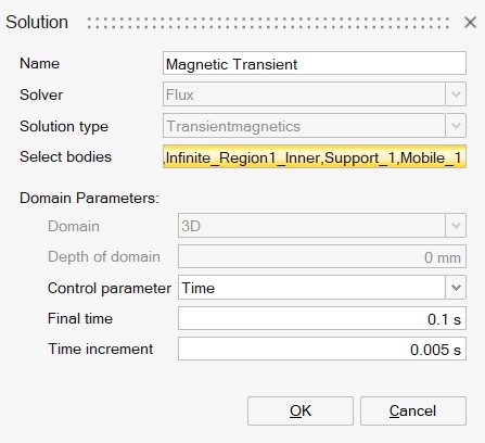 It is possible to pilot either Time or Angular position or Linear position. Please refer to Magnetic Transient solution for more information on the solution dialog box.