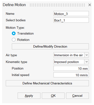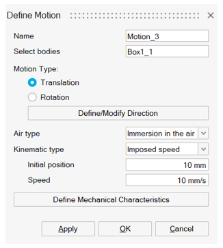 - In this version: In the use case of Immersion in the air air type (mostly for Translation use case), the contact between the fixed device bodies (except surrounding air body) and moving bodies is forbidden. In consequence, user must choose carefully the motion parameters values in the solution box to keep a gap between the moving bodies and the fixed bodies for all solving steps.
