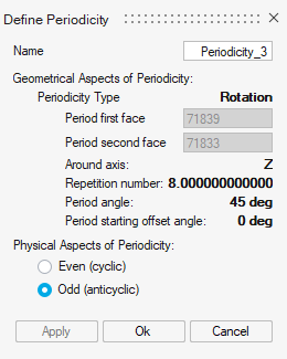 Currently only circular periodicity is supported in 3D with the boundary conditions of cyclic(Even) or anti-cyclic(Odd). Selected periodic axis will be drawn in graphics window for visualization purpose.