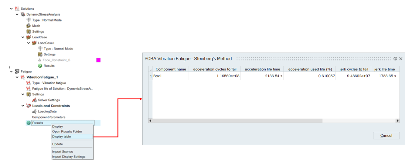 The relative displacement based on the Steinberg model and the normal mode result is calculated. With that ratio, the fatigue life of the component is computed.