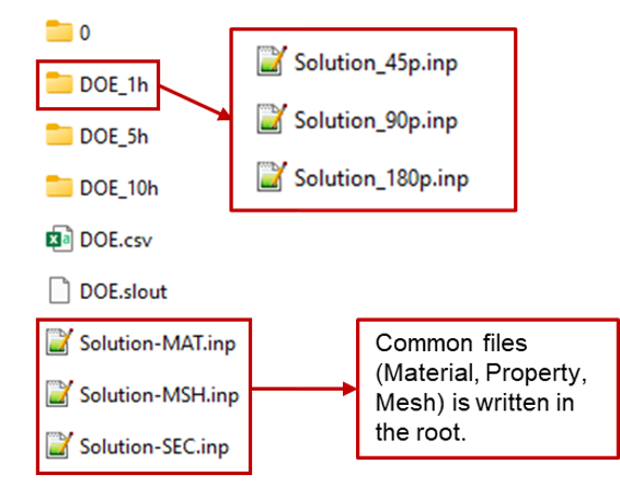 This option is used to organize the folder structure while exporting the solver deck file. When exporting, it writes geometry data, material, and properties into different files: MSH, MAT, and SEC, respectively. This separation helps maintain a structured and organized set of output files.